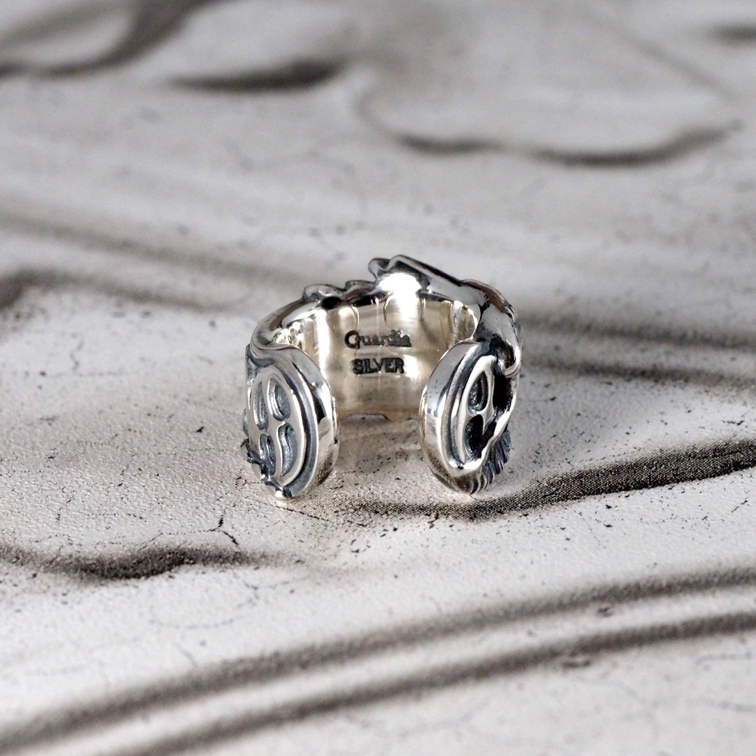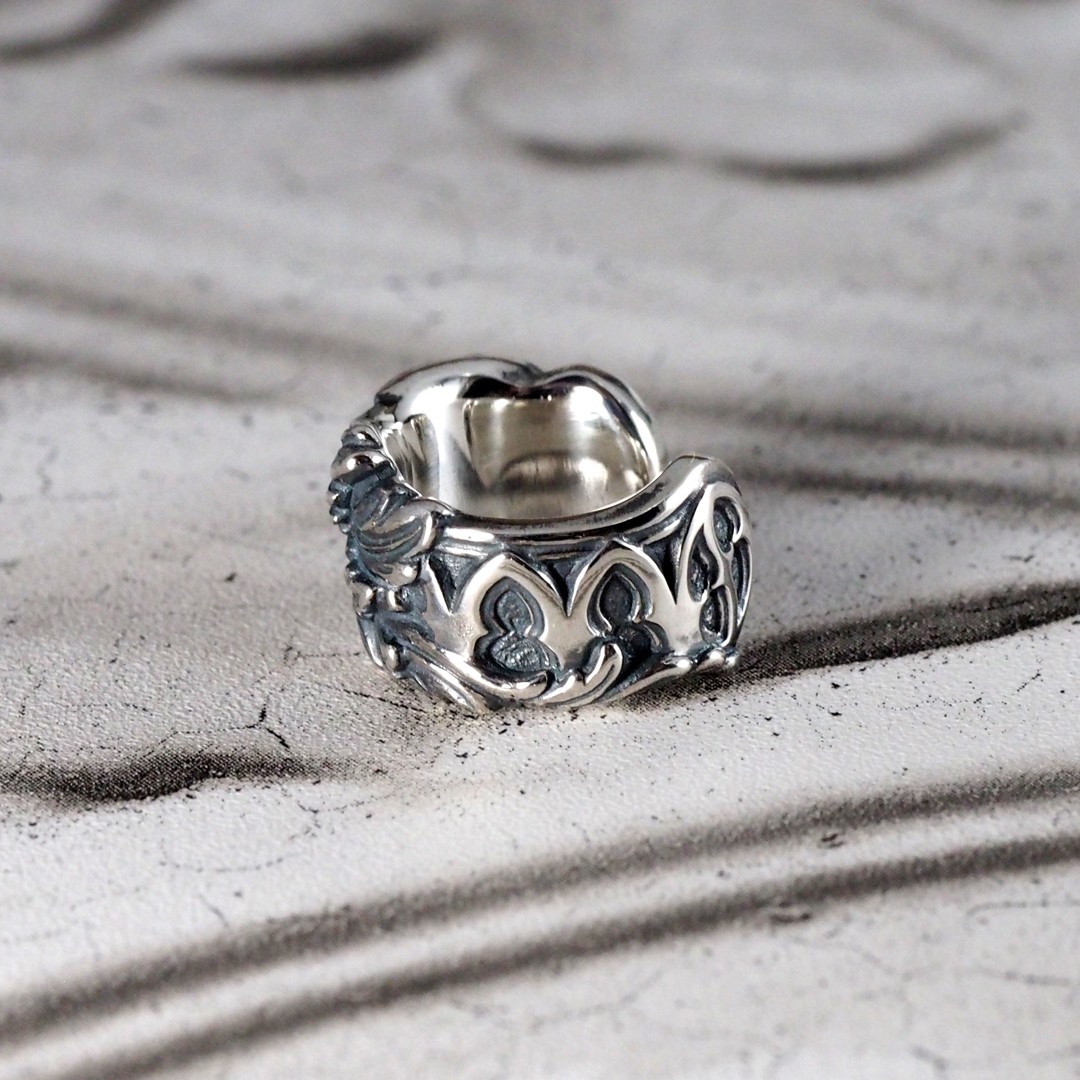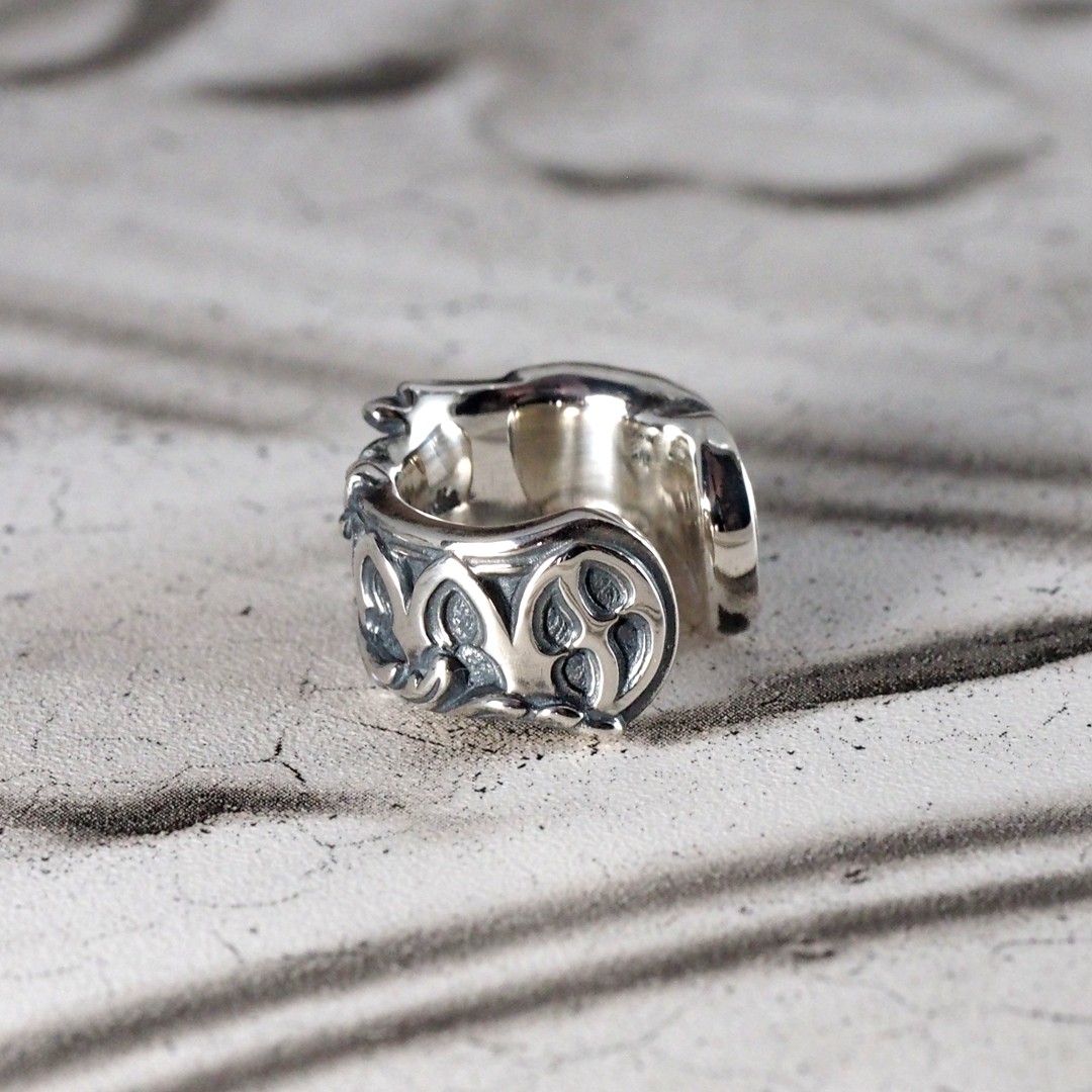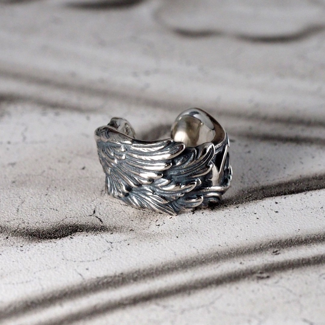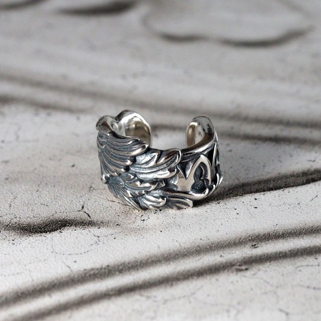 天使の羽と聖堂の薔薇窓装飾の要素が合わさったデザインのイヤーカフです。左耳に着ければ羽が正面になり、右耳に付ければ装飾の方が正面になります。
