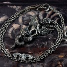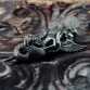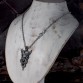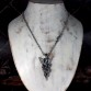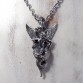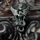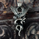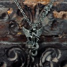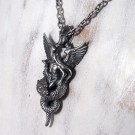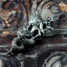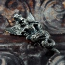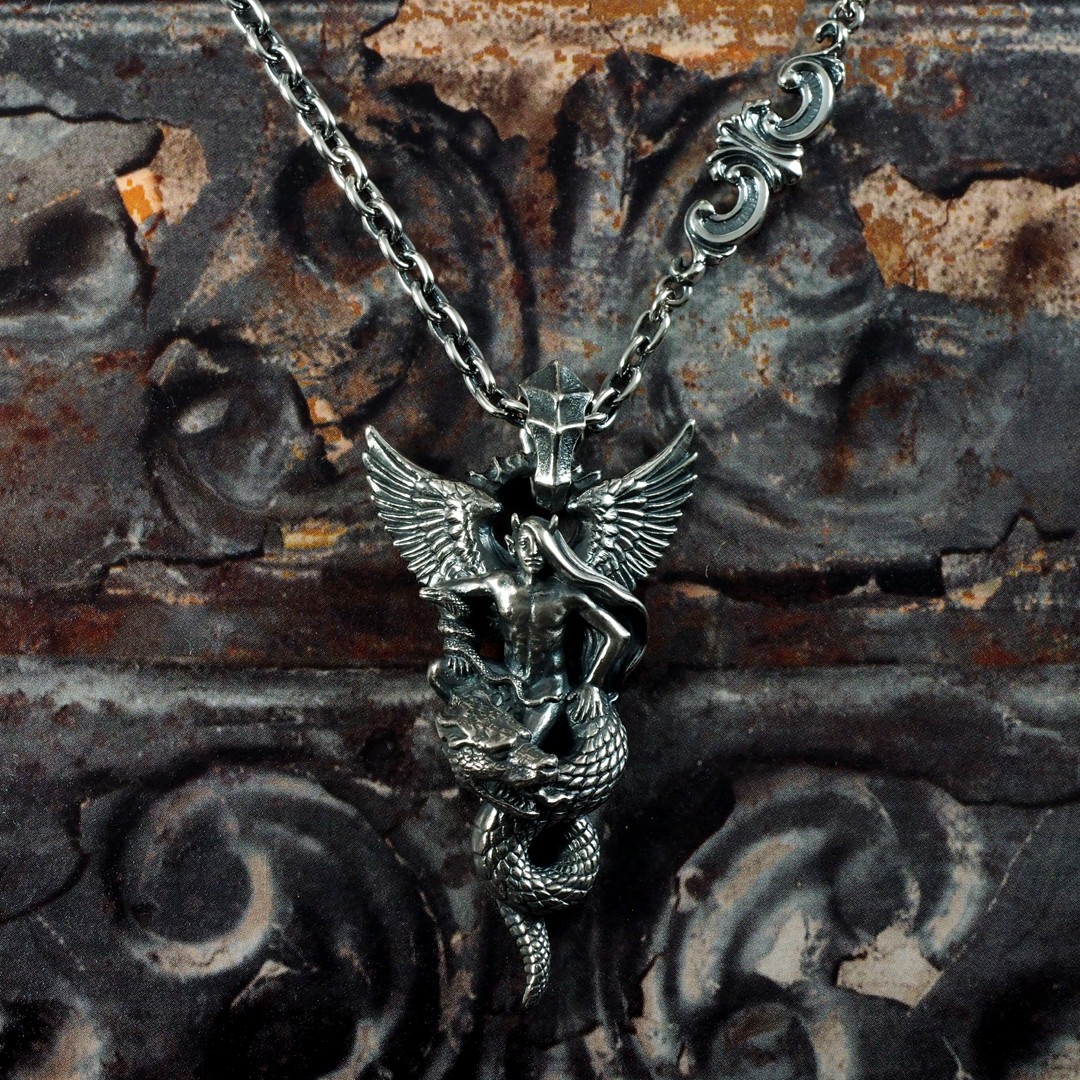 身を乗り出すようにドラゴンに跨るアスタロトの姿を表しました。ドラゴンは、大昔の空想画に描かれるような、羽も脚も表情も無く、揃った歯がびっしり並ぶ不気味なイメージにしました。全体のシルエットが鋭角な鏃のような、迫力あるペンダントトップです。