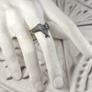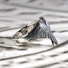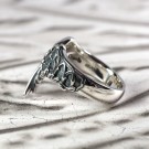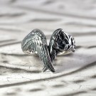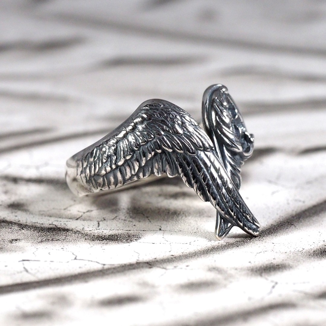 重なる両羽のリング。片方の羽には聖堂の薔薇窓が入り、天使の神秘性を表しています。Vの字のシルエットが指を優雅に飾ります。